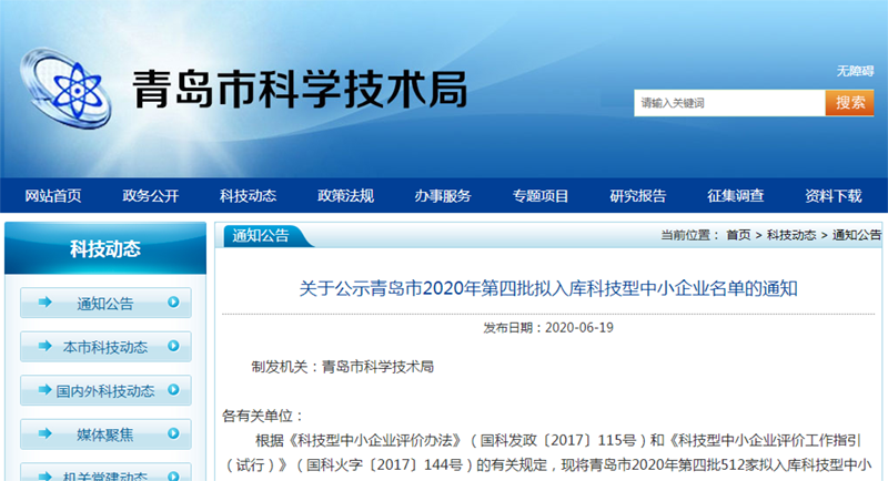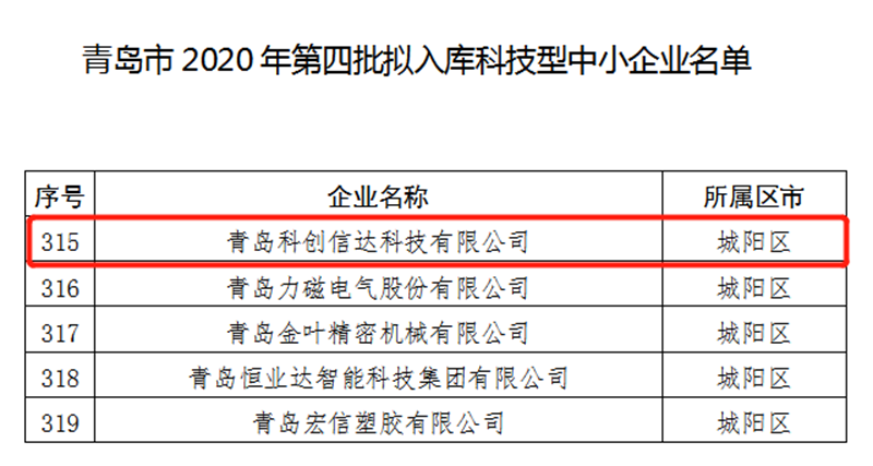 2020年6月19日,青島市科技局公布了2020年第四批進(jìn)入科技型中小企業(yè)的名單,青島科創(chuàng)信達(dá)科技有限公司通過此次認(rèn)定,成功入庫(kù)青島市第四批科技型中小企業(yè)。